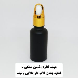 • شیشه قطره 50 میل مشکی با قطره چکان قلاب دار طلایی و میله