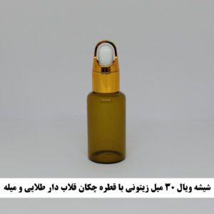 • شیشه قطره 30 میل قهوه ای با قطره چکان قلاب دار طلایی و میله قطره
