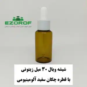 • شیشه ویال ۳۰ میل زیتونی با قطره چکان سفید آلومینیومی و میله