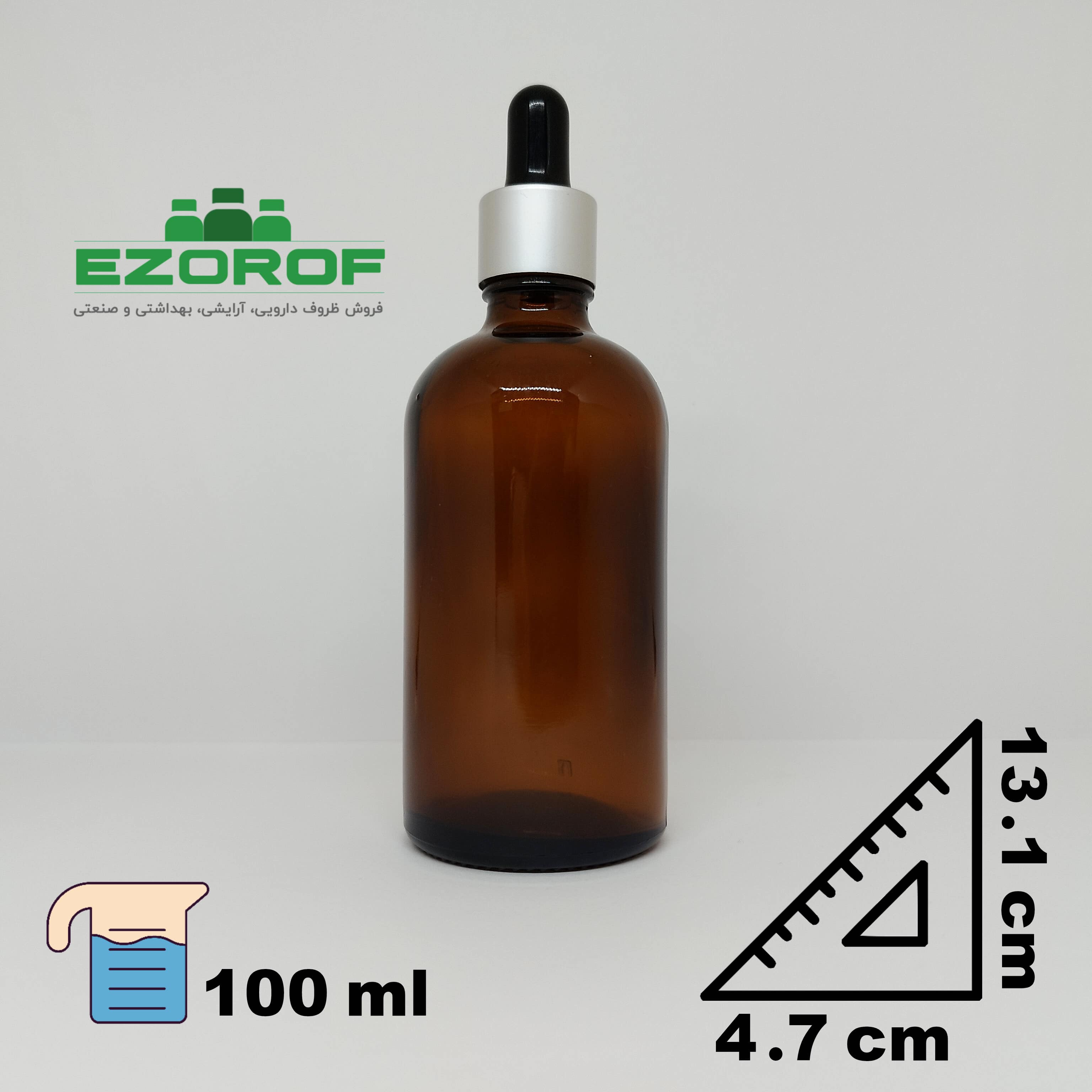 شیشه قطره 100 میل قهوه ای با قطره چکان نقره ای مات مشکی و میله