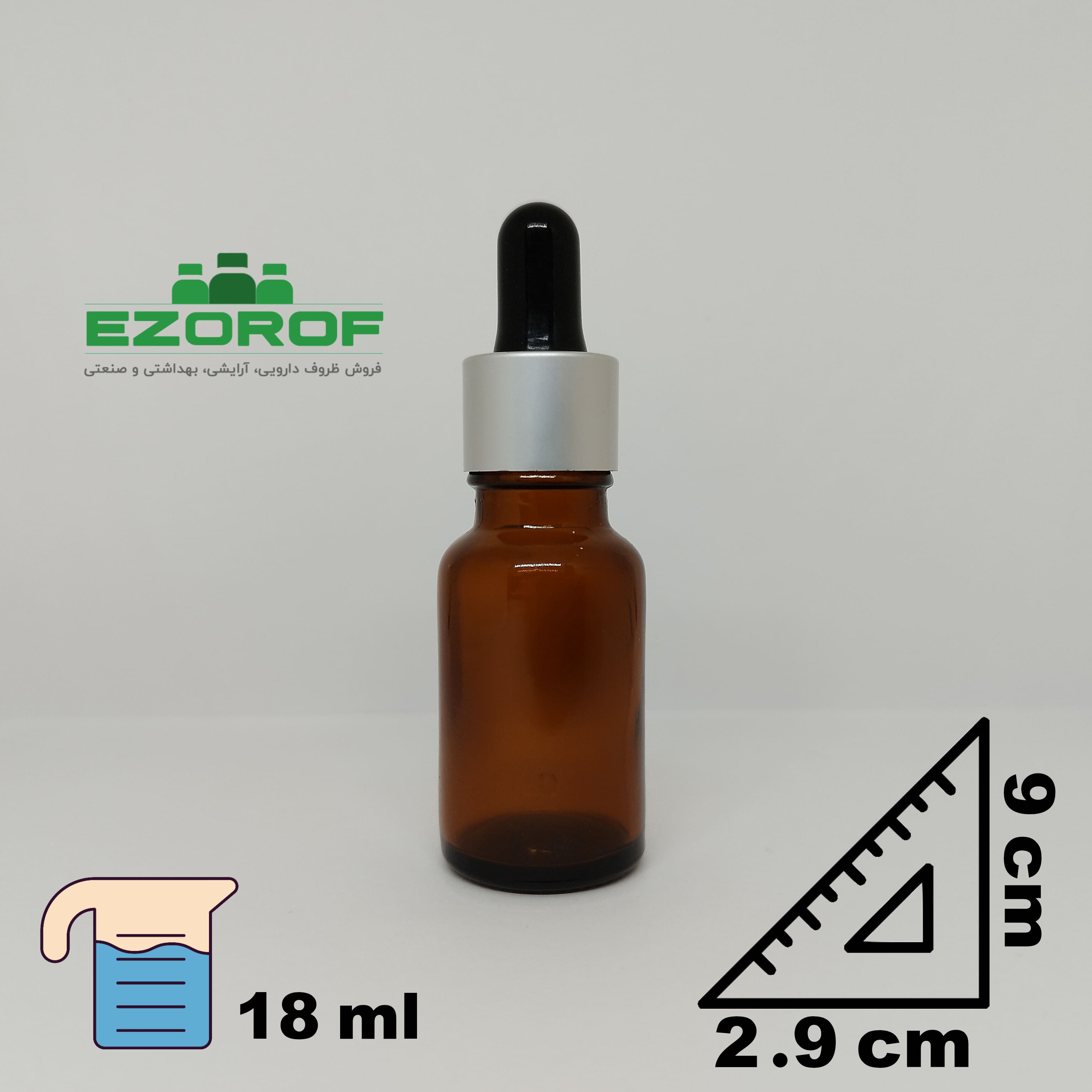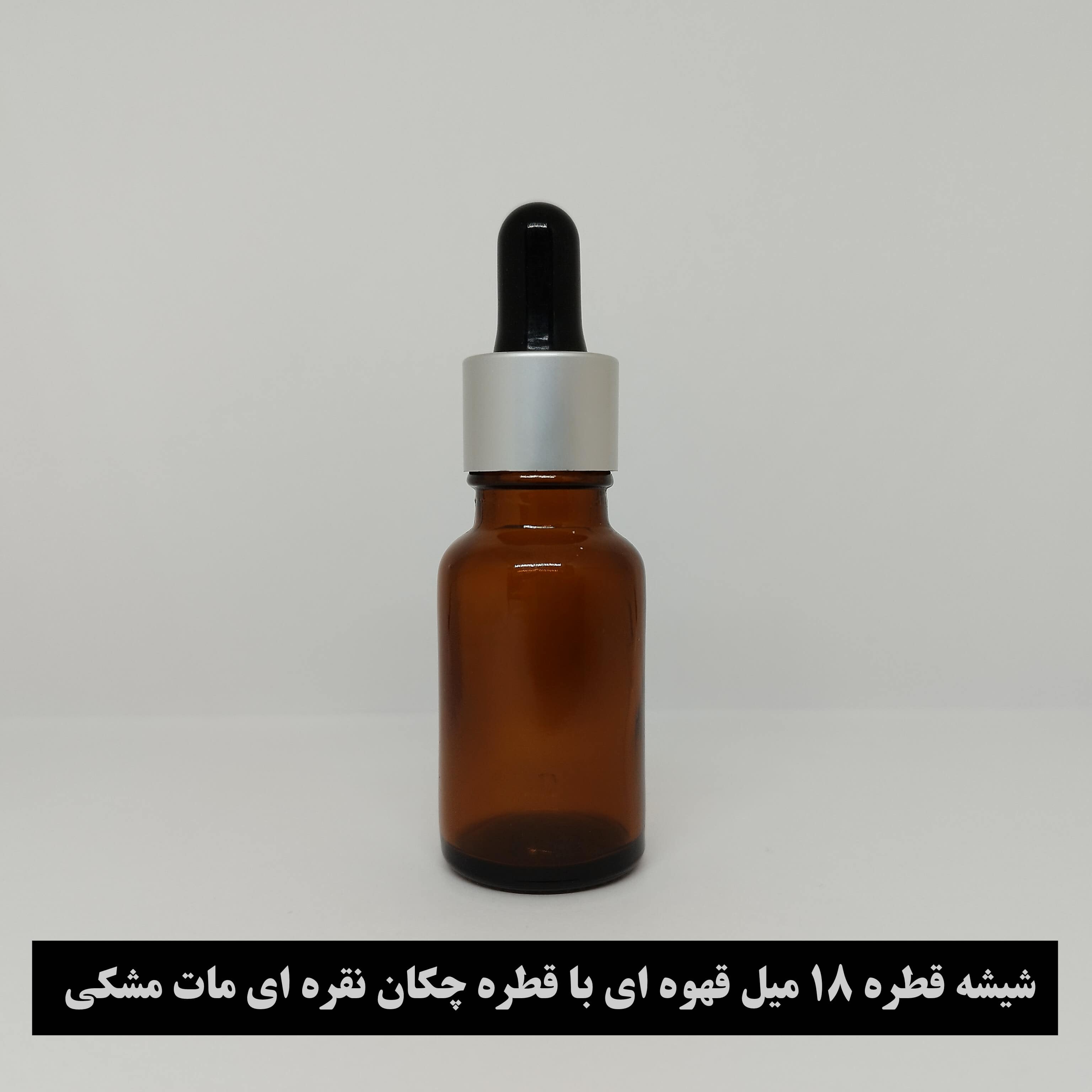 شیشه قطره 18 میل قهوه ای با قطره چکان نقره ای مات مشکی و میله