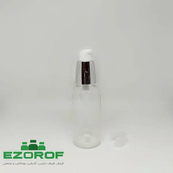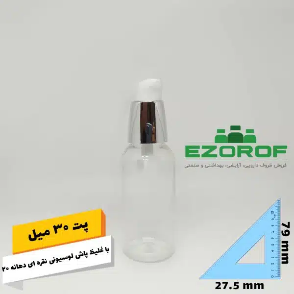 پت ۳۰ سی سی شفاف با غلیظ پاش لوسیونی نقره ای وارداتی دهانه ۲۰ همراه با درب محافظ