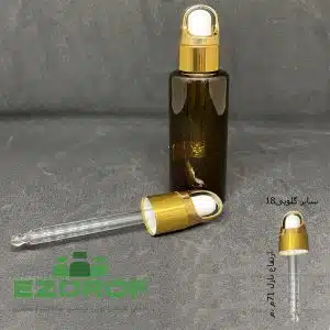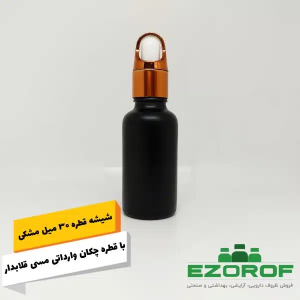 شیشه قطره ۳۰ میل مشکی دهانه ۱۸ با قطره چکان مسی قلابدار وارداتی
